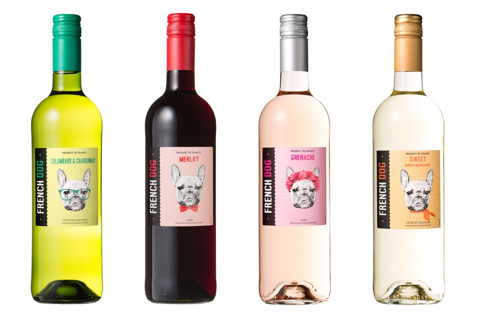 フレンチブルドッグがデザインされた、本場フランスのワイン。飲み終わってもボトルを飾りたくなる可愛さ。