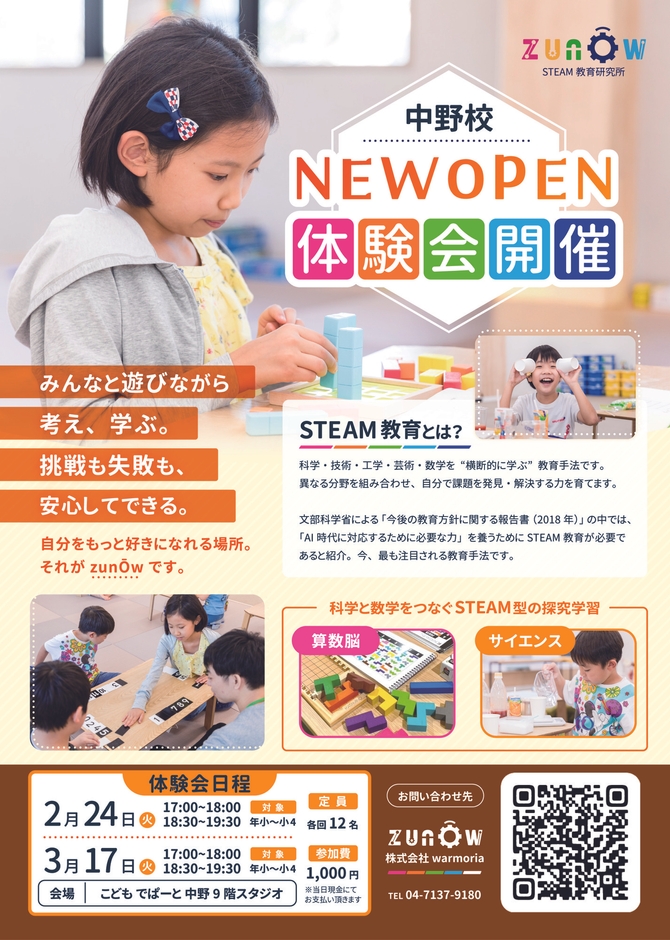 株式会社warmoria(本社:千葉県流山市おおたかの森東4丁目1-6、代表:平野智史)は、教育・音楽・落語を融合した新発信プロジェクト「まなびと頭脳」を開始いたします。同時に、次世代型STEAM教室「zunŌw」が都内展開を本格化し、2026年4月に中野駅前で新規開校いたします。2026年2月より体験会の開催も決定し、池袋校もリニューアルオープンいたします。より多くの家庭へSTEAM教育を届けてまいります。