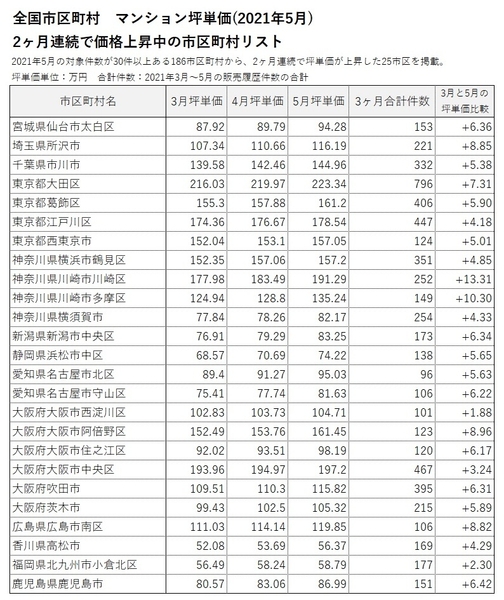 「マンションレビュー」2021年5月 全国市区町村 マンション坪単価 ランキング100を発表