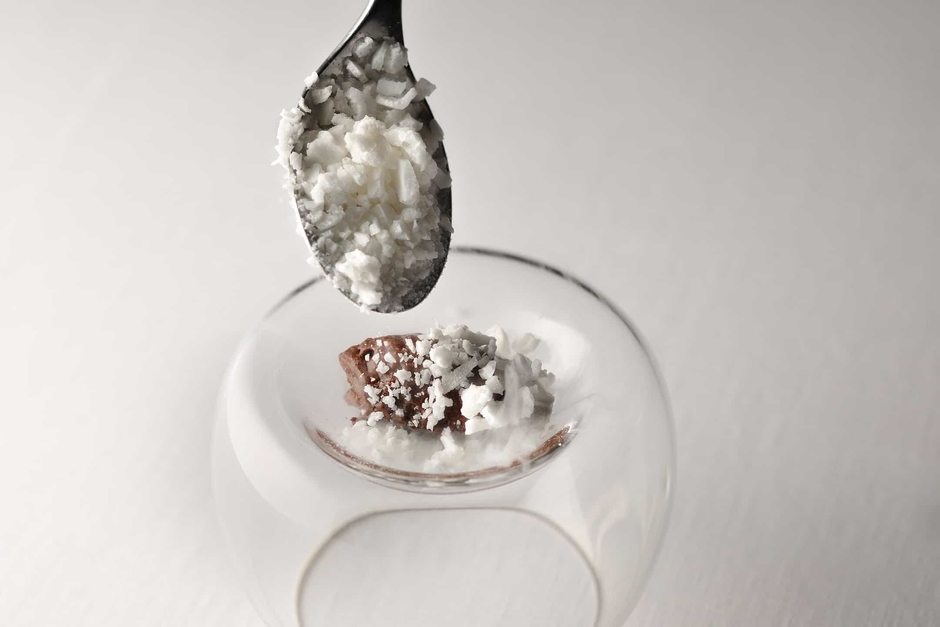 濃厚なショコラと牛蒡を合わせた一品です。ショコラのムースと牛蒡の甘いエッセンス、キャラメルが重なり合い、気品あふれる一皿に仕上げました。