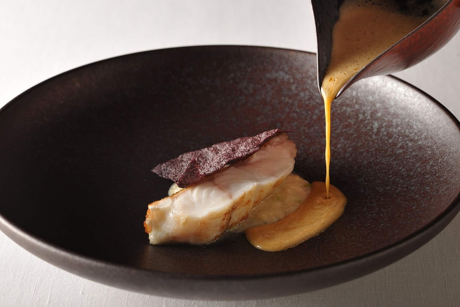 旬の魚に、蟹や魚のアラを濃縮させたソースを合わせた一品です。付け合わせには、リゾットに見立てた萌やしや黒米のチュイルを合わせ、魚とソースとが重層的な味わいを生み、フランス料理の魅力が詰まった魚料理に仕立てました。