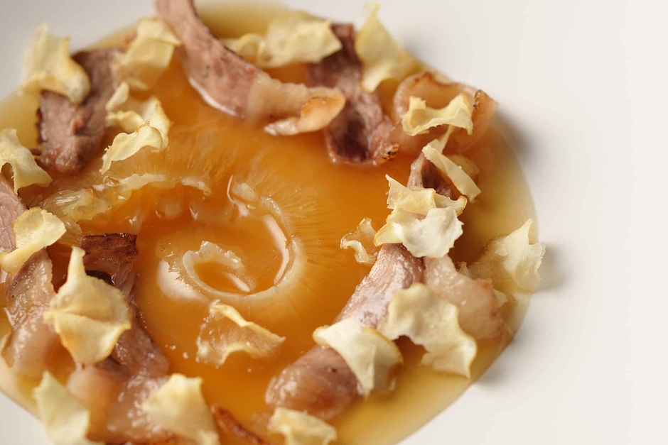 冬の名物「鮟鱇」を使用し、津軽地方で食べられる郷土料理「鮟鱇の共和え」を、フランス料理にアレンジしました。こだわりの味噌とオニオンフォンデュを合わせ、コースのスタートらしい、軽やかな仕立てにしています。魚の肝とは思えない脂の乗った濃厚な旨味を味わえます。
