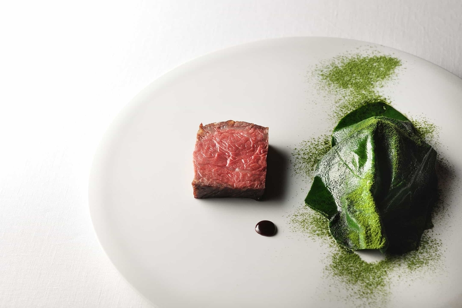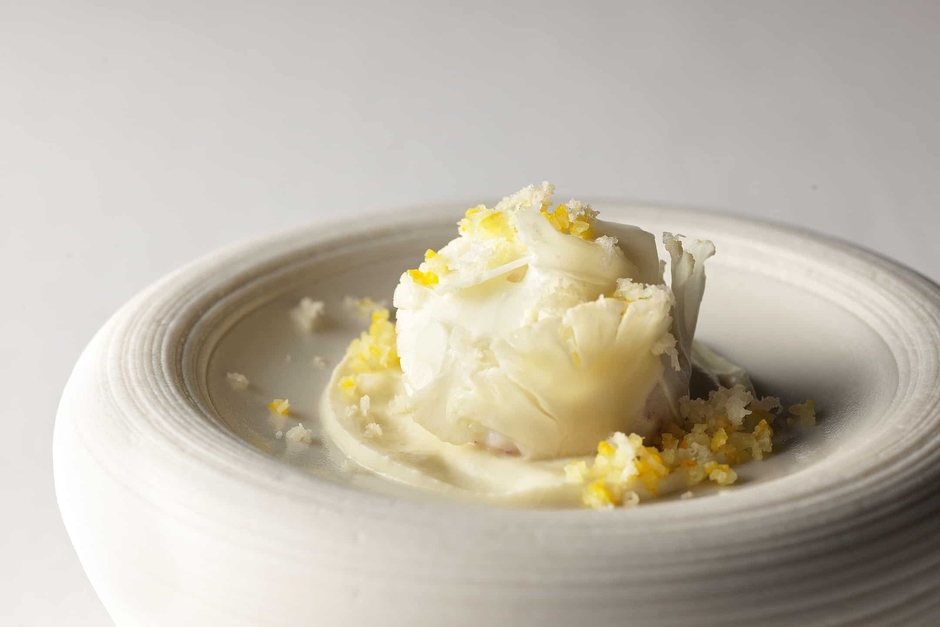 烏賊の甘味を引き出す為に、穏やかな味わいのカリフラワーを合わせ、香りのアクセントに柚子を添えた一品です。烏賊は火を通し、カリフラワーと合わせて焼売風に仕立てることで、甘味を引き出しました。烏賊の甘味を強く感じつつも食べやすい仕立てにしています。