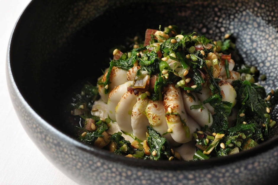 軍鶏をベースとした濃厚なソースと白子、胡麻を合わせ、ほろ苦い春菊とのコントラストが特徴の一品です。白子と深い旨味の胡麻、アクセントに加えたナッツのカリっとした食感が呼応し、食べごたえはありつつも、白子が後に引かないように仕立てました。