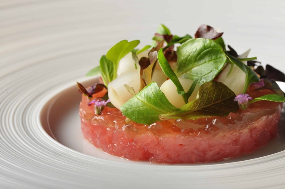 鮪のタルタルに、日本酒で焚き上げソース状にした百合根、鮪節で取っただしに魚醤を合わせたジュレを添えた一品です。冬の鮪は、脂が乗り鉄分や酸味が穏やかになるため、付け合わせには優しい口当たりの百合根を合わせました。アクセントにハーブやクルトンを散らし、多様な食感を楽しみながらも、冬の鮪の食感や味わいを引き立てバランスにもこだわりました。