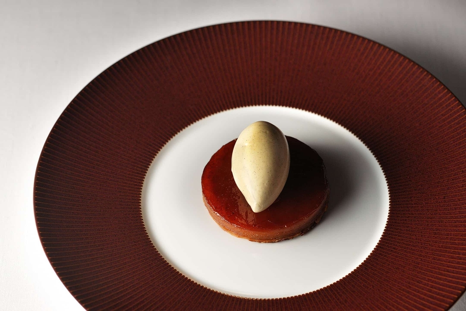 まるごと1個のりんごを薄くスライスして重ね、4時間程かけてじっくりと焼き上げ、冷たいアイスクリームを添えた一皿です。りんごの甘酸っぱさや香ばしさが口の中に広がり、りんご本来の美味しさと共に、凝縮したりんごの複雑な味わいを楽しめます。