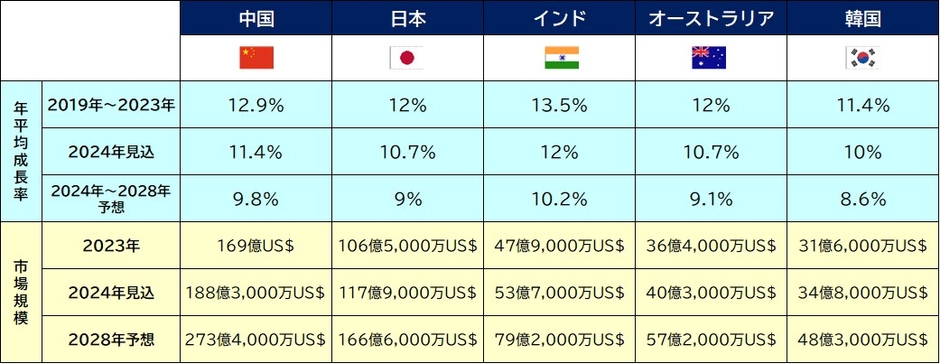 アジア太平洋地域は国ごとに市場規模に差はあるものの、成長率はおおむね同様の伸びを示しています。これは、ロイヤルティプログラムの成長が各国の経済規模に関わらず、すべての国でほぼ同時期にデジタル化が普及し、同じスタートラインから同様に展開が進んだからではないかと思われます。