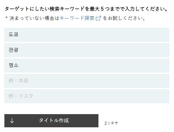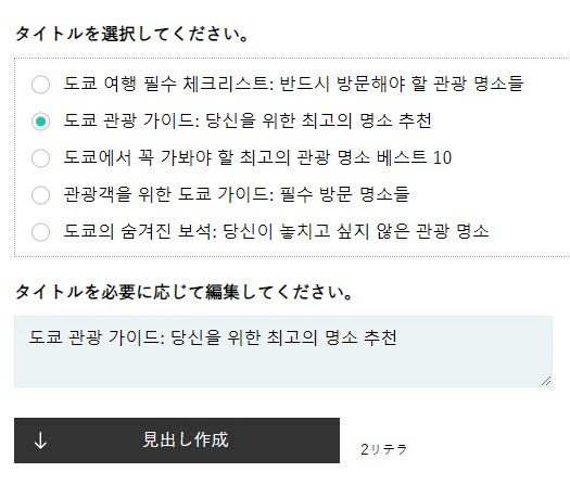 ターゲットキーワードを入力して「タイトル作成」を押すとターゲットキーワードを踏まえたタイトルが出力されますので、選択し、必要に応じて編集します。