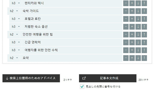 タイトル選択/編集の後に「見出し作成」ボタンを押すとSEOに強い構成で見出しが抽出され、必要に応じて編集することもできます。