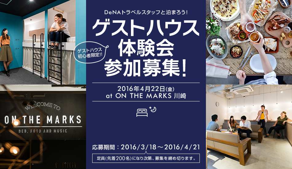 2016年3月18日 10:00オンライン総合旅行サービス「DeNAトラベル」(http://www.skygate.co.jp)を運営する株式会社DeNAトラベル(本社:東京都新宿区、代表取締役社長:中野 正治、以下DeNAトラベル)は、ゲストハウスの利用経験がない“旅行初心者”を対象としたイベント「ゲストハウス体験会」を2016年4月22日(金)にON THE MARKS川崎(http://www.on-the-marks.jp/kawasaki/)で開催します。
