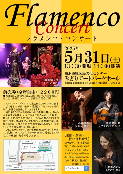 ヒラルディージョ事務局主催、『Flamenco Concert』が2025年5月31日 (土)に横浜市緑区民文化センター みどりアートパーク(神奈川県 横浜市緑区 長津田 二丁目1番3号)にて開催されます。