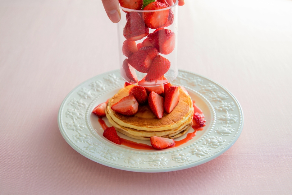 また、今回は、いちごの贅沢感をより味わってもらう演出として、パンケーキといちごを別々にご提供いたします。筒の中に詰まったいちごをお客様自身でトッピングし最後の仕上げをして頂きます。焼き立てふわふわなパンケーキの上に、ゴロゴロいちごをお皿いっぱいに溢れ出す様子をお楽しみください。最後に口当たりが軽く、ふんわりとしたエスプーマと甘酸っぱさが特徴のトロトロないちごソースをかけてご堪能いただけます。