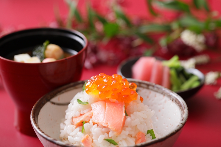 ・お好みで選んで頂く三種類御飯(鮭と大葉の炒めご飯 いくら添え/ 梅とシラス大葉の炒めご飯 / ガーリックライス)