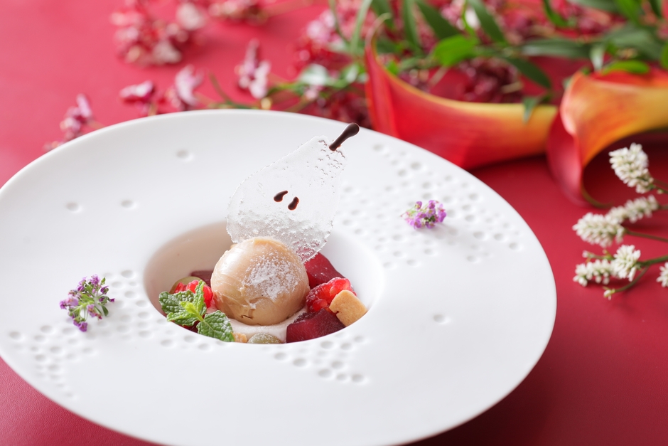 ・秋の味覚 洋梨の赤ワインコンポート キャラメルのグラスを添えて
