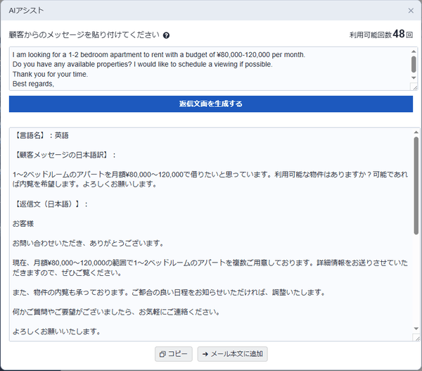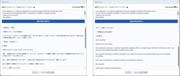 不動産賃貸営業では迅速かつ正確な対応が求められますが、「AI添削」と「AI返信作成」を利用したことで業務効率化と品質向上を実感しました。