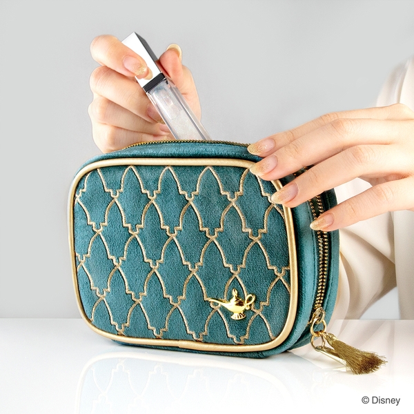 ピーコックブルーカラーに、『アラジン』の世界観を感じるアラビア風の模様をゴールドのステッチでデザインしたポーチ。「魔法のランプ」のオーナメントが輝きワンポイントになっています。