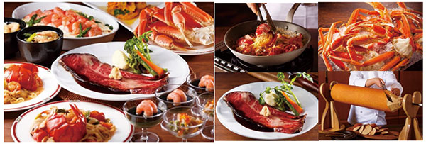 大好評のグルメバイキングプランで最大直径30cmを誇る豪快な「アメリカンローストビーフ クラシックスタイル」や「オマール海老と海の幸のペスカトーレ」や「ズワイガニの冷製」などの豪華な「海老・蟹・ビーフ料理」が勢揃いしました。また、バイキングを召し上がりながら、ランチは「ミニクラシックコンサート」、ディナーは「ジャズライブ」もお楽しみいただけます。