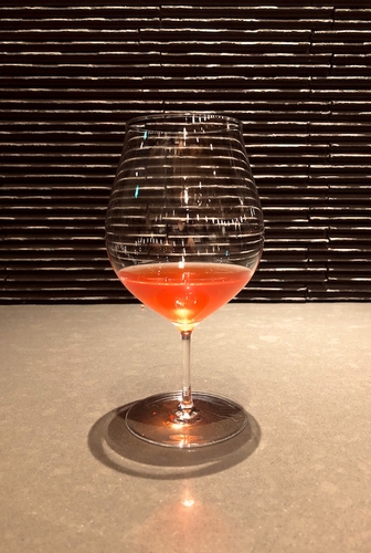 カクテルの構成:漢方茶「AMBER BLEND」、クランベリージュース、ジュニパーベリー、黒コショウ、ピンクペッパー、ドライにしたバラの花、乾燥ポルチーニ