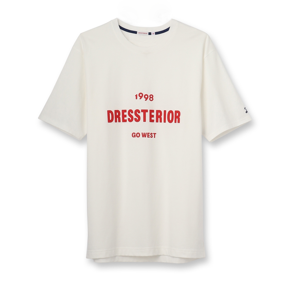 ドレステリアのロゴとブランドスタート年の1998年、また大阪をイメージした『GO WEST』の文字がデザインされたグラフィックTシャツは、 袖にブランドイニシャルのチェーンステッチがポイントで入った特別なデザインです。
