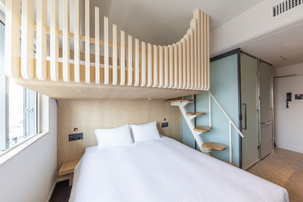 新しく誕生した客室は、下段にダブルサイズのベッドを備えた「バンクベッドルーム(ダブル)」と、シングルベッド・ソファーベッドを備えた「バンクベッドルーム」の2種類。どちらの客室も最大3名様でご利用いただけます。また、バスタイプはバスタブのないシャワーブースを採用することで、居住空間を広く確保いたしました。