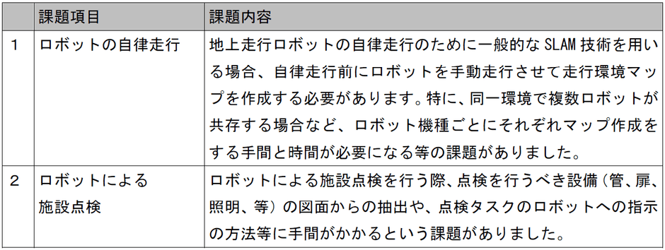 インフラ施設の老朽化や点検技術者不足を背景に、施設内設備点検の省力化が求められている中、ロボットによる施設点検の期待が高くなっているものの、実現に向けては下表のような課題があります。