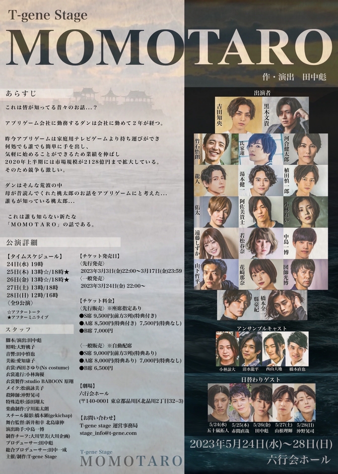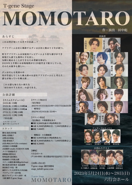 T-gene stage(東京都中央区、代表:田中一成)主催、『MOMOTARO』が2023年5月24日 (水) ~2023年5月28日 (日)に六行会ホール(東京都品川区北品川 2-32-3)にて上演されます。
