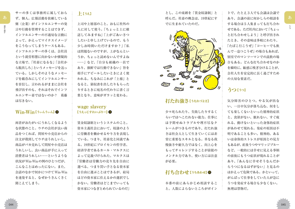 愛社精神/あいみつ/アウトソーシング/アウトプット/アカウント/アグリー/アゴアシ付き/アサイン/朝活/足/アジェンダ/足元の悪い中/アジャイル/預かり/明日やろうは馬鹿野郎/遊び/アチーブメント/安土敏/アットホーム/アテンド/後出しジャンケン/後付け/あのころは良かった/アポなし/天海祐希/アンテナを張る/あんばい/いい意味で/いい会社/イエスマン/異業種交流会/育児休暇/イケハヤ/勇み足/石和温泉/意識高い系/椅子取りゲーム/板挟み/一億総活躍/一存/一生に一度のお願い/言った言わない/一丁目一番地/いってこい/一本/稲盛和夫/イニシアチブ/いのちの電話/イノベーション/今どきの若者は/色をつける/岩瀬大輔/印鑑/インセンティブ/インターンシップ/インフルエンサー/Win-Win/上/wage slavery/打たれ強さ/打ち合わせ/うつ/うっちゃる/打てば響く/うまいもんでも食って帰んな/裏どり/えいや/ASAP/エクスキューズ/エクストリーム出社/エクストリーム通勤/Excel化/依怙贔屓/SNS/エスカレーター式/SDGs/エナジードリンク/NR/エビデンス/MTG/MBA/縁故採用/炎上/円満退社/おいおい/オーガナイズ/OJT/おごったったやん/お先に失礼します/おざなり/おじさん構文/お歳暮/お茶出し/お中元/お疲れさまです/おっしゃられる/お局/お電話が遠い/落としどころ/オフピーク通勤/オブラート/オフレコ/お前の代わり/お見送り/オンスケ/オンとオフ/オンライン会議