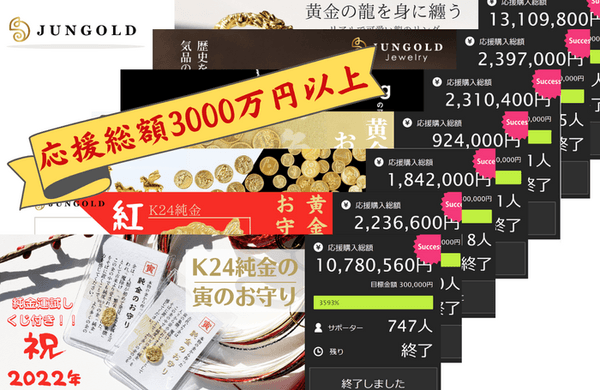 純金ブランド「JUNGOLD」では、これまでMakuakeのプロジェクトで、3000万円以上の応援額を頂きました。