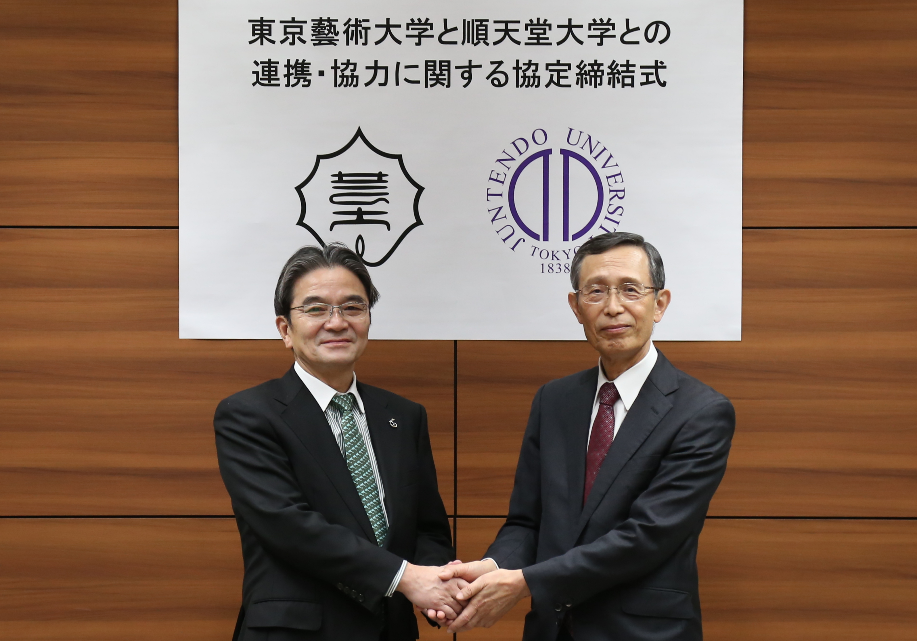 協定締結式には木南英紀・順天堂大学学長、宮田亮平・東京藝術大学学長が出席し、固い握手の下、協定を締結しました。