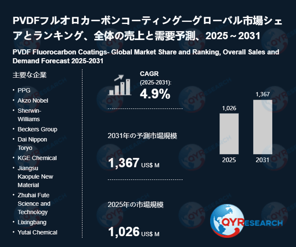 QYResearchが発表した新たな市場調査レポート「PVDFフルオロカーボンコーティング―グローバル市場シェアとランキング、全体の売上と需要予測、2026~2032」によると、世界のPVDFフルオロカーボンコーティング市場規模は2024年の約982百万米ドルから2025年の1026百万米ドルへと順調に拡大すると見込まれ、予測期間中は年平均成長率(CAGR)4.9%で成長し、2031年には1367百万米ドルに達すると予測されている。