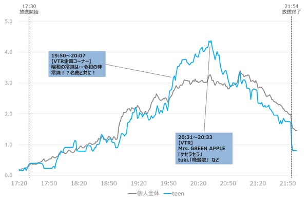 20:00〜20:40にかけてteen層の視聴率が上昇していました。この時間帯は昭和の常識を紹介するVTR企画から、昭和の名曲を次々に流すプログラムで、teen層にも受け入れられていることがわかります。