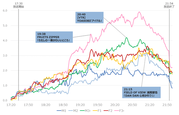 また、FIELD OF VIEW 浅岡雄也の「DAN DAN 心魅かれてく」やBAADの「君が好きだと叫びたい」が放送された場面は、M2層やF2層の視聴率が高くなっています。