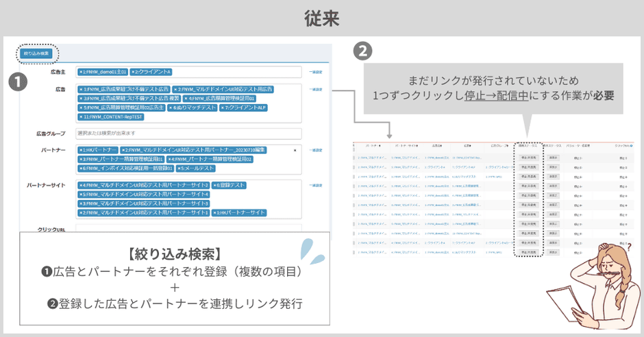 時間短縮:広告に対して数百本のパートナーサイトを紐づける場合、提携作業時間がおよそ10分の1になります。