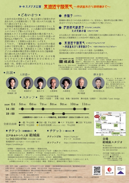 小金井市民の皆様方より、地元公演のご要望の声が高まる中、この度満を持して「第一回スタジオ公演」を行う運びとなりました。「東海道中膝栗毛~赤坂並木から卵塔場まで~」をはじめ三本の古典演目を、ここ武蔵小金井の結城座スタジオにてご覧いただきます。