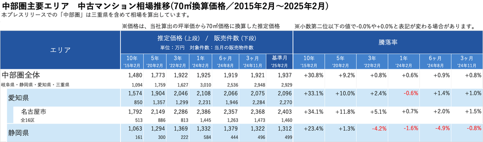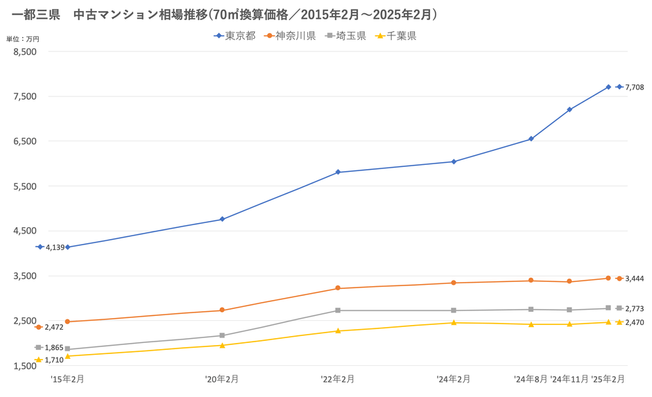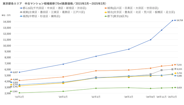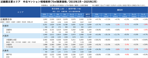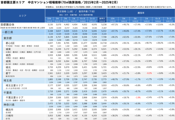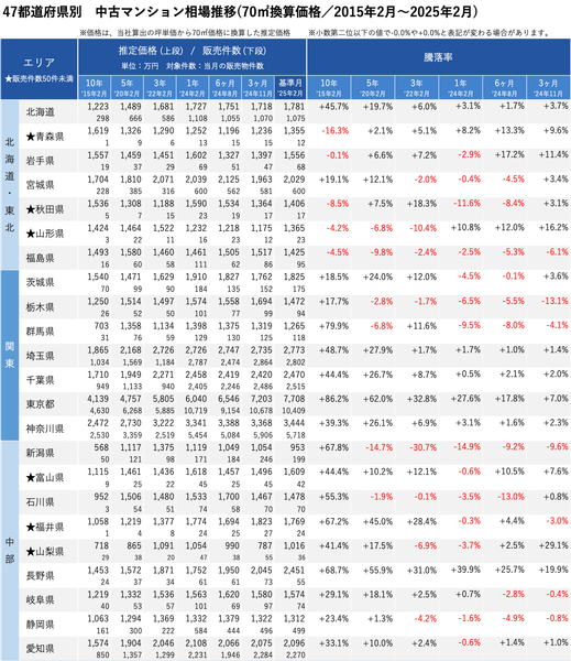 「不動産×WEB×ビッグデータ」の領域で、さまざまな不動産テックサービスを展開する株式会社ワンノブアカインド(本社:東京都港区、代表取締役社長:川島 直也、以下当社)は、当社が運営しているマンション情報サイト「マンションレビュー」の保有データを元に、全国の2025年2月の中古マンション相場を調査。坪単価をベースに70㎡での価格に換算した「中古マンション価格」*1について、10年前・5年前・3年前・前年からの推移を都道府県別・エリアごとにまとめましたので、発表いたします。