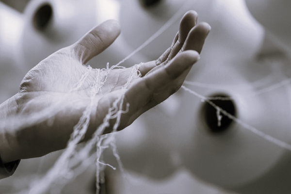オリジナルで製造したCOOLIO(クーリオ)の強撚糸は、「清涼感」に優れた植物系再生繊維のキュプラを多く使用しています。キュプラは、繊維中に水分を多く含むこと、熱伝導率・熱拡散率が高いことなどが影響しており、COOLIO(クーリオ)の強撚糸は、繊維に触れると肌から繊維へ瞬間的に熱が移動して、冷たく感じるようにつくられています。