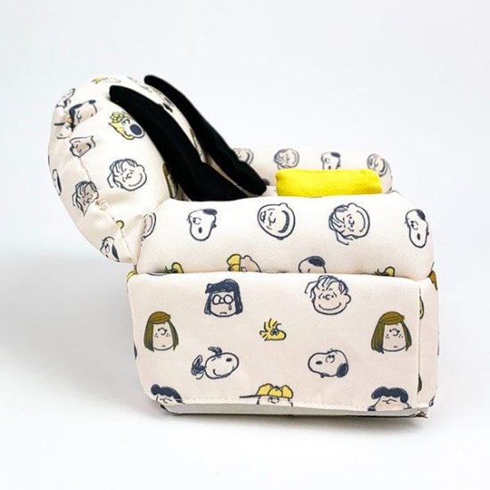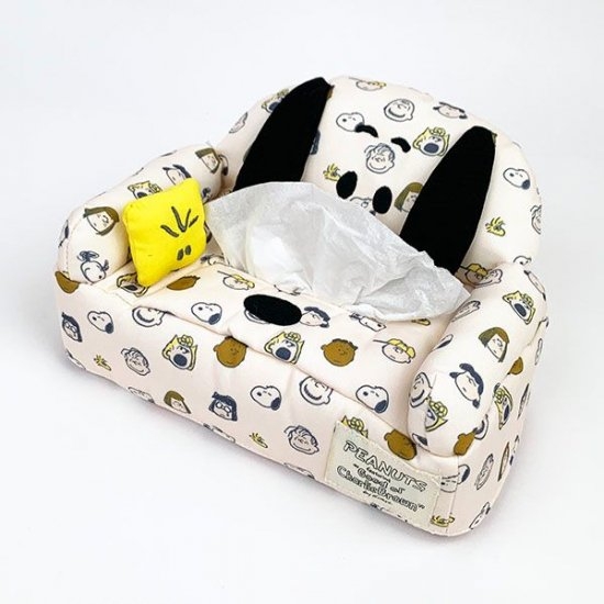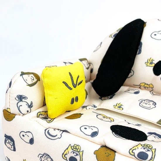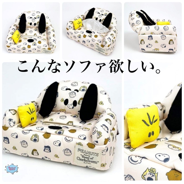 スヌーピーからソファー型のティッシュケースのご紹介です。正直、筆者は画像を見て最初ソファかと本気で思っていました。コミック柄のデザインの生地にウッドストックのクッション、背もたれにはスヌーピーのお顔が隠れているとっても素敵なティッシュケースなんですよ♪