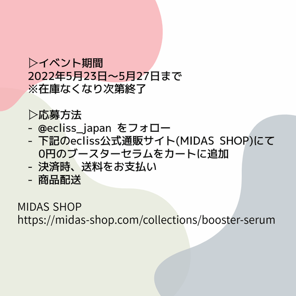当ブランドは、少しでもお礼に気持ちで、Instagram(@ecliss_japan)、Twitter(@ecliss_japan)を中心に送料だけでブースターセラムが体験できるイベントを実施中です。