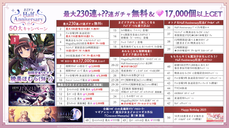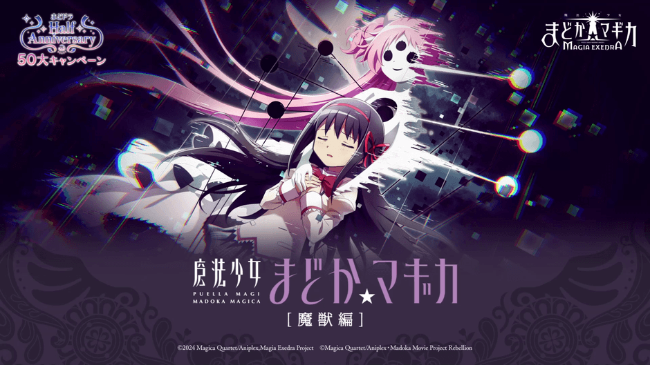 株式会社アニプレックス(本社:東京都千代田区 代表取締役 岩上敦宏 以下アニプレックス)は、『魔法少女まどか☆マギカ Magia Exedra』(Magia Exedra:マギアエクセドラ)において、9月28日(日)20時より、「まどドラ ハーフアニバーサリー記念 50大キャンペーン」を開催いたします。50大キャンペーンでは、新限定★5キオクとして 暁美ほむら(リボン)、ストーリーコンテンツとして『魔法少女まどか☆マギカ [魔獣編]』の実装、さらに最大230 連ガチャ無料や、マギカストーン最大6,000個獲得できるログインボーナス、など盛りだくさんの内容となっています。さらに10月下旬から長編オリジナルストーリーコンテンツとして、『マギアレコード 魔法少女まどか☆マギカ外伝 Crescent Memoria』をフルボイスで配信します。