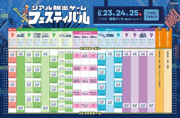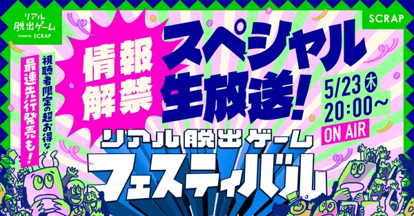 全世界で累計1,300万人以上を動員しているリアル脱出ゲームを企画制作する株式会社SCRAP(本社:東京都渋谷区、代表:加藤隆生)は、幕張メッセ展示ホール4~7にて8月23日(金)~25日(日)の3日間限定で開催される、『リアル脱出ゲームフェスティバル』の開催コンテンツを追加発表いたします。