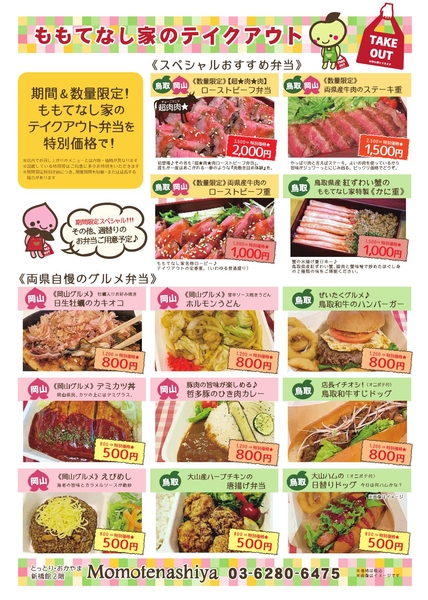 2階ビストロカフェももてなし家において、このキャンペーンに併せて、鳥取・岡山両県自慢の食材を使ったテイクアウト弁当を特別価格で販売中です!