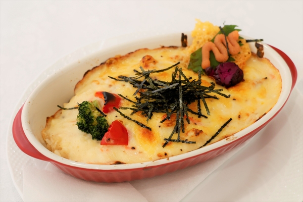 あさりのしぐれ煮を使用したごはんで和のベースにしながら、ホワイトソースに米粉を使用。ボリュームがありながらも、小麦粉よりもあっさりした食べ応えになるように工夫。また、ごはんは炊き込みではなく混ぜ込みとし、大量調理に活用しやすくなるよう汎用性も意識