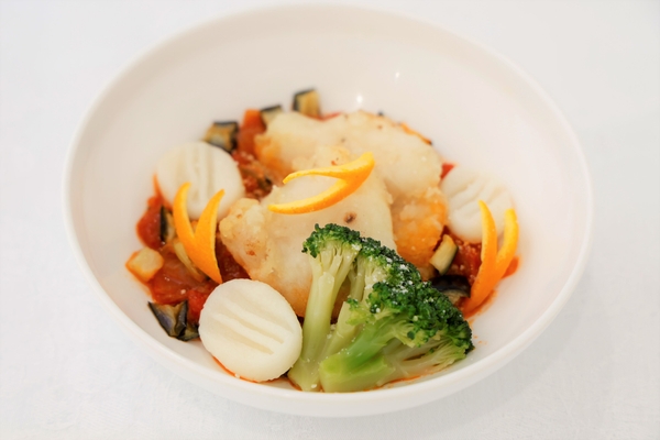 近年の食材原価の上昇を鑑み、比較的安価な白身魚「バサ」を使用し、臭みをさわやかなオレンジや酸味のあるトマトソースで中和。付け合わせのニョッキ(団子状のパスタの一種)にも米粉を使い、グルテンフリーで幅広い世代に食べられる一品に