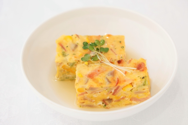 洋風の擬製豆腐で、彩りを加えるため、カラフルで安価な具材をできるだけ使用。米粉の特性を活かしたモチモチ感が出るような味わいにし、作業工程も「切る→混ぜる→蒸し焼き」で簡単に。切る作業を失敗しても、刻み食やミキサー食に使用可能で、フードロス削減にもつなげる
