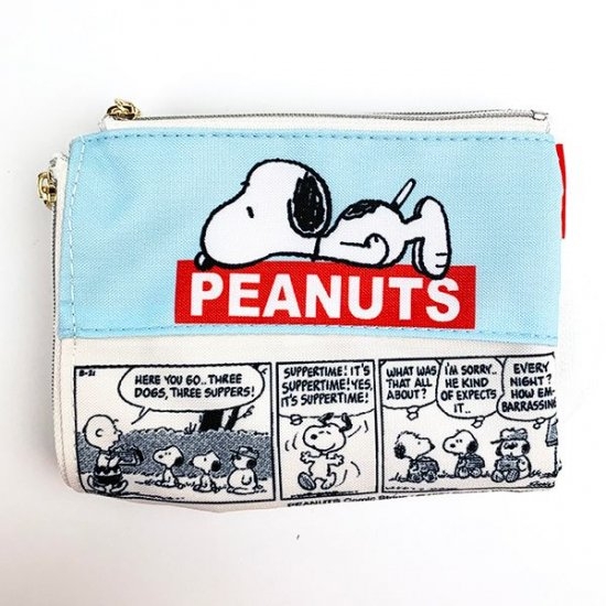 ティッシュポーチ側はスヌーピーの寝そべりデザイン&コミックデザインです。大きい面はファスナーがサイドまで開くので、中身を出し入れしやすくて機能的♪
