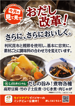 “おいしい” “ワクワク” “ハッピー” をお届けするライフコーポレーションは、3月1日(水)より惣菜売り場で販売しているライフオリジナル煮物各種を、豊かな香りとまろやかな味わいが特徴の天然だしを使用しさらにおいしくリニューアルいたしました。