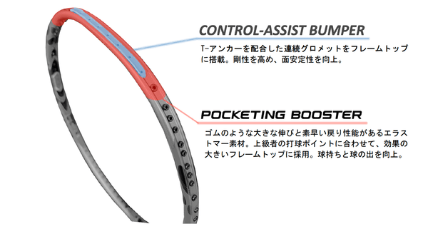 フレームトップには、「T-アンカー」を配合した連続グロメット「CONTROL-ASSIST BUMPER(コントロールアシストバンパー)」を搭載し面安定性がアップ。さらに、ゴムのような大きな伸びと素早い戻り性能があるエラストマー素材を用いた「POCKETING BOOSTER(ポケッティングブースター)」を上級者の打球ポイントに合わせて、効果の大きいフレームトップに搭載し、球持ちと球の出が向上しました。