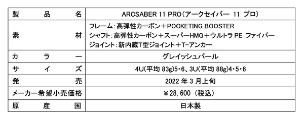 本製品は新設計・新構造採用により、従来品「ARCSABER 11」の特徴である球持ちと打球感の良さをさらに進化させ、より精密にコースを狙えるコントロール性能を実現しました。