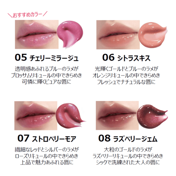 たっぷりのラメと、とろけるようなツヤ膜が重なり合い、ぷるんとした粘膜ニュアンスを演出。保湿力や唇へのうれしさはそのまま。うるおいベールがまるでリップパックのように密着し、ハチミツや5種の植物オイルなどの保湿成分配合で乾燥や荒れを防ぎます。「ラメ× ツヤ× ニュアンスカラー」の絶妙なバランスで、あなたにぴったりの1本をぜひ見つけてお楽しみください。