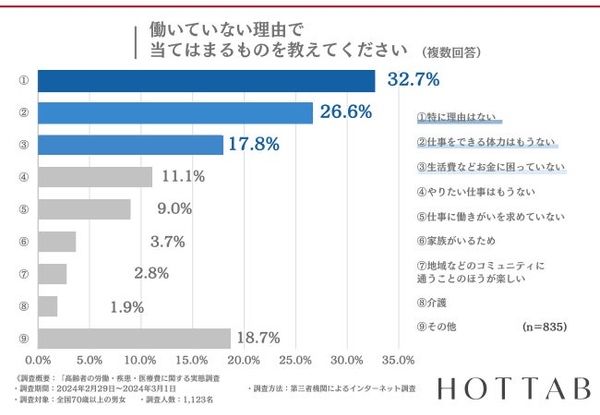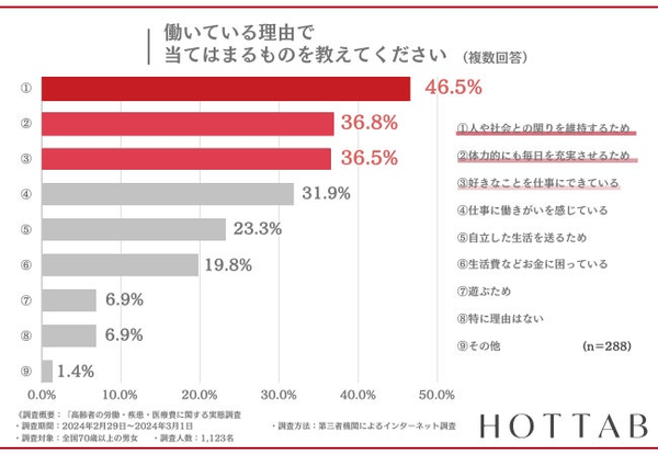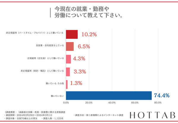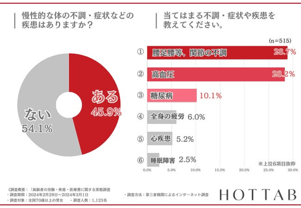 このような背景の中、株式会社ホットタブは70歳以上の男女1,123名を対象に『高齢者の労働。疾病。医療費』に関する調査を行った。この調査は日本の高齢者の現状を調査し、病気にならない健康つくりで充実した老後生活を送るヒントを得ることを目的としています。